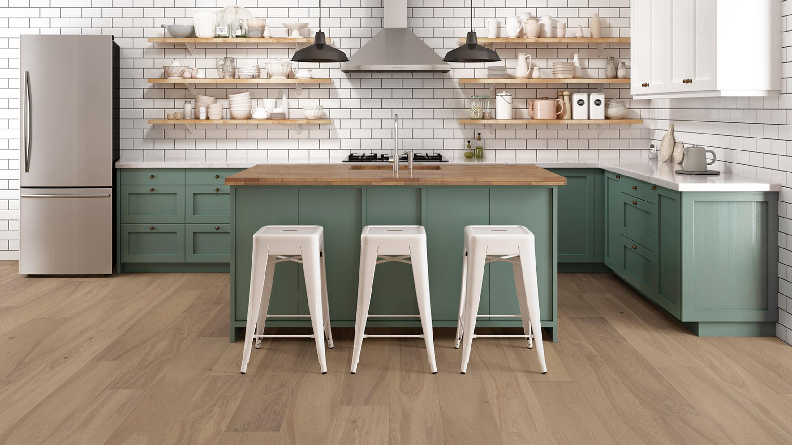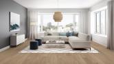 Achieve a luxurious and generous 7½" wide-plank effect at a very affordable price with Tempo. This rustic-grade hardwood in oak or hickory features brushed veneer, lively grain patterns and rich color variations. Some designs from the collection include additional touches, such as filled knots and custom stain treatments.